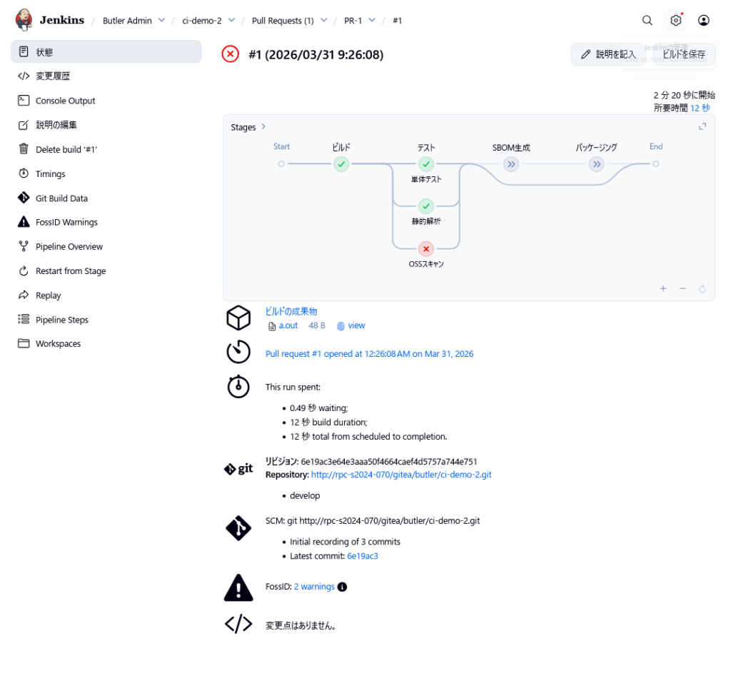 変更用のブランチを作成し、ライセンスポリシー違反や脆弱性を含むソースコードをプッシュしてプルリクエストを作成すると、パイプラインは diffscan の実行箇所で失敗します。 Jenkins のジョブの実行結果の画面では、ライセンスポリシー違反や脆弱性の検出の様子を確認できます。