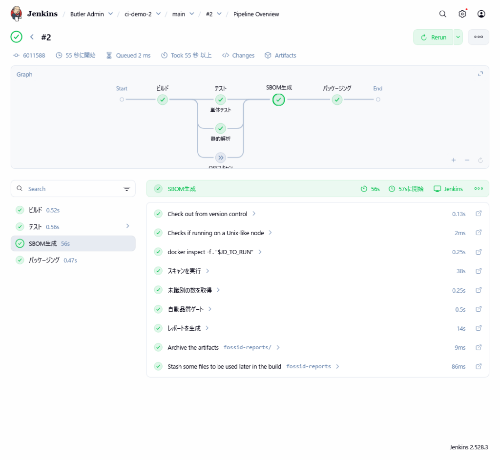 実行可能な Jenkinsfile の例を以下に記します。「OSSスキャン」ステージではプルリクエスト等で diffscan コマンドを実行します。「SBOM生成」ステージではメインブランチにマージした時等で FossID Workbench でスキャンを実行し、最終的に SBOM を生成します。