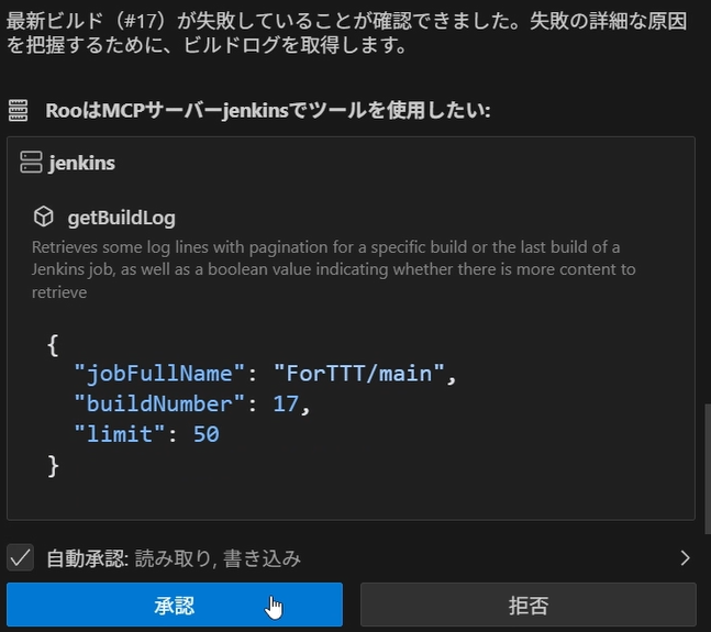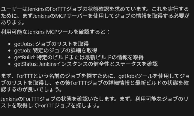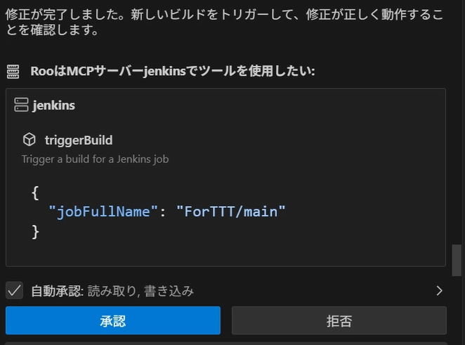 ジョブの実行もJenkinsに直接アクセスすることなく、MCPクライアントから実行が可能です。