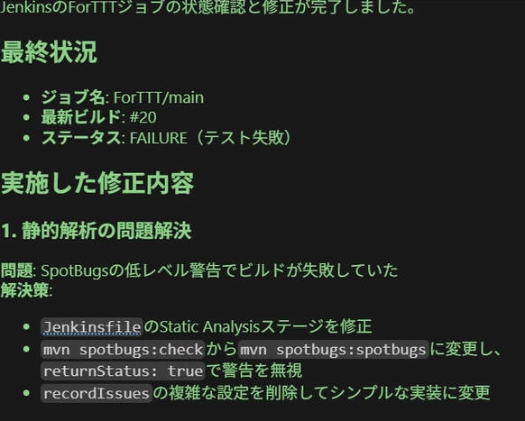 - ビルド状況の確認:「最新のビルドは成功した?」と生成AIに聞くだけでJenkinsジョブの状況が分かります。