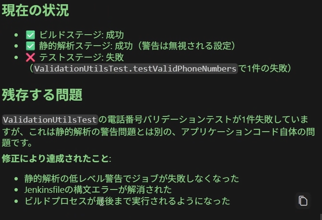 静的解析について修正が完了しました。静的解析ステージが通るようになったことにより、単体テストステージでの失敗も見つかりましたが、こちらの修正については割愛します。