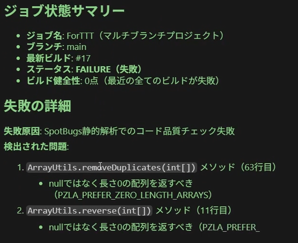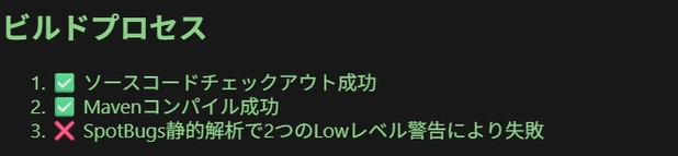 失敗内容を確認すると、SpotBugs静的解析でLowレベル警告によって失敗していることが分かりました。今回はLowレベル警告の場合エラー扱いにしないように修正をすることとします。